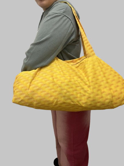 Un grand sac type bowling en bâche événementielle recyclée, pensé pour le sport, les escapades ou la vie active — fabriqué avec soin dans notre atelier d’insertion solidaire.
